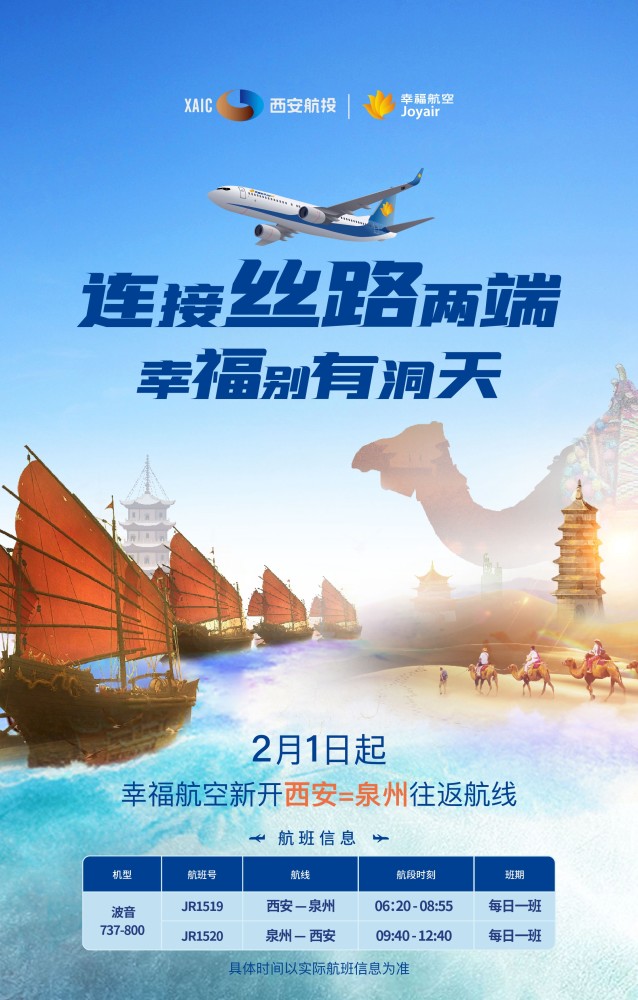 泉州是“古代海上丝绸之路起点”和我国著名的海港口岸。西安作为“古代陆上丝绸之路起点”和国家级中心城市,在新丝绸之路经济带建设中定位于“一带一路经济带核心区”,是连通内陆与亚欧大陆桥和丝绸之路的交通枢纽。西安=泉州往返航线的开通,是幸福航空2020/2021年冬春航季期间,继西安=乌鲁木齐往返航线后的又一条“新丝路航线”,以西安为中心,形成了连接西北至南部沿海重点城市的航线网络,方便多地乘客出行和经济文化的交流,,也标志着幸福航空在助力新丝绸之路经济带建设与联通“一带一路”倡议城市的道路上又迈进一步。