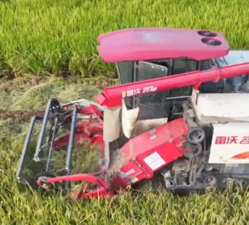 不远处的安徽阜南,雷沃谷神履带机正在抢收水稻。当地政府按照先熟先收、有涝先收、易损先收的原则,统筹调度300余台履带式收割机抢收。