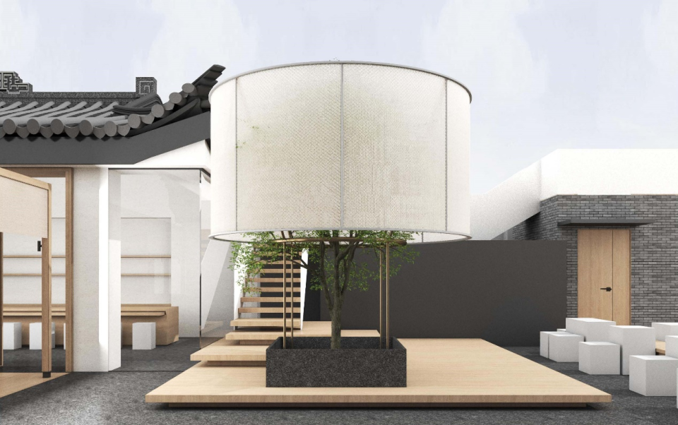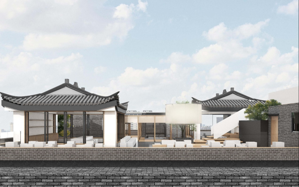 露台空间被打造为“市檐浅酌厅”,以原木与玻璃的材质为骨,融入仿古建筑檐角的工艺巧思,创造出一个集微醺品饮、文化漫谈、古建观景等复合体验为一体的独特空间。