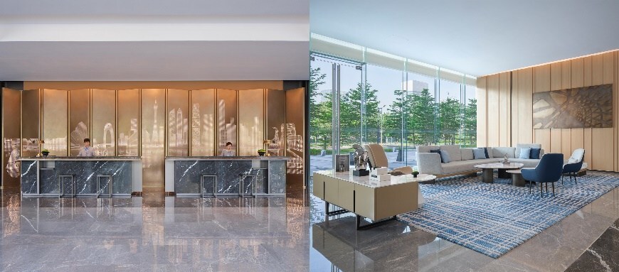 广交会万怡酒店设计紧扣"千年商郡,云山珠水"主题,生动再现广州作为"海上丝路"起点的波涛帆影与厚重深沉的岭南文脉。大堂前台的装饰背景墙以古铜金属精雕细琢出广州往昔辉煌盛景到现代都市的繁华变迁,大堂内灵动点缀的艺术装置及挂画生动呈现岭南灵韵,让宾客踏入酒店即可领略广州古今交融的独特魅力。