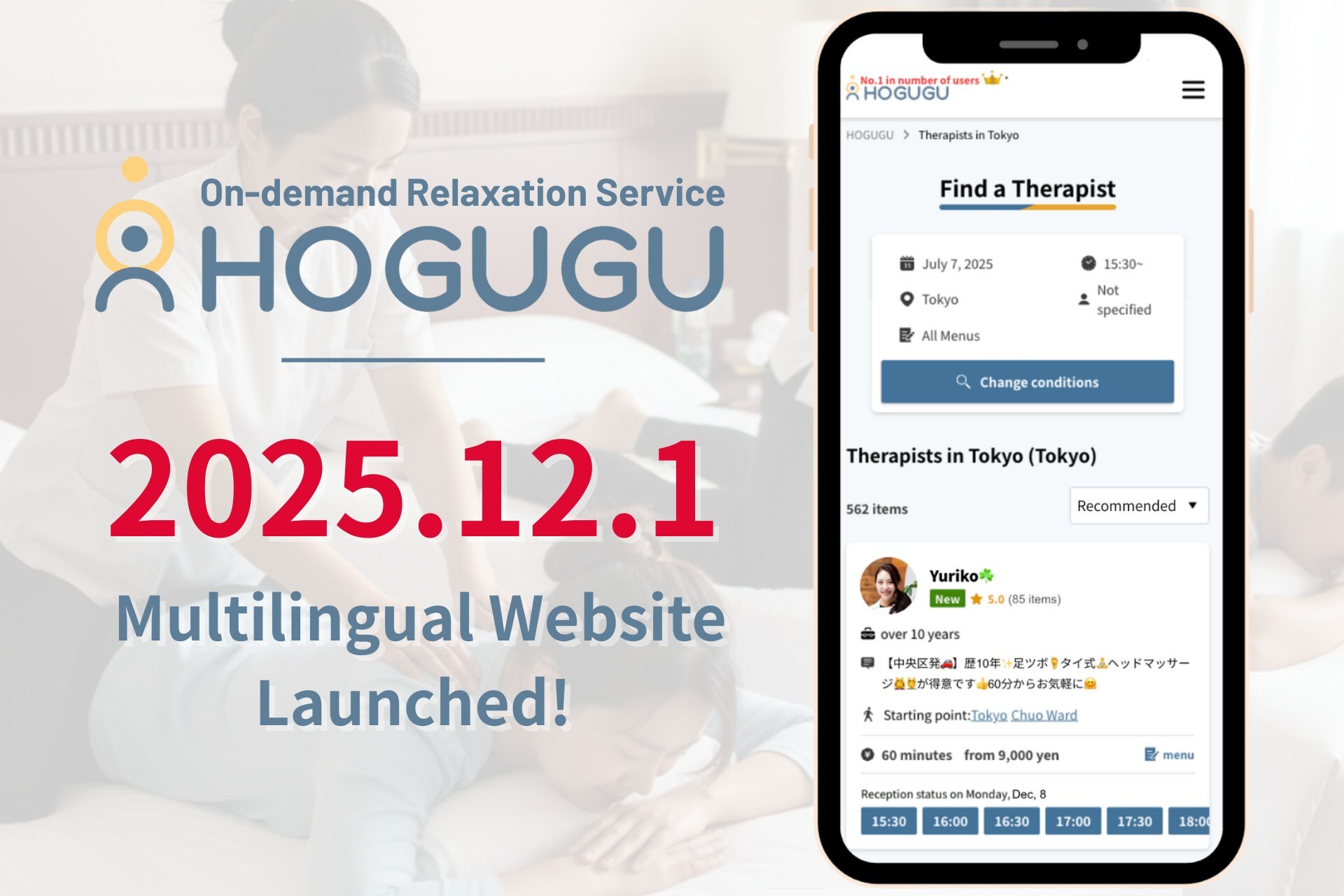 日本上门放松服务平台HOGUGU推出全新多语言网站,并新增多项功能。随着日本旅游业的复苏,越来越多的海外访客及在日居住的非日语使用者希望能使用其他语言预约服务,此次平台升级正是为了回应这一需求。