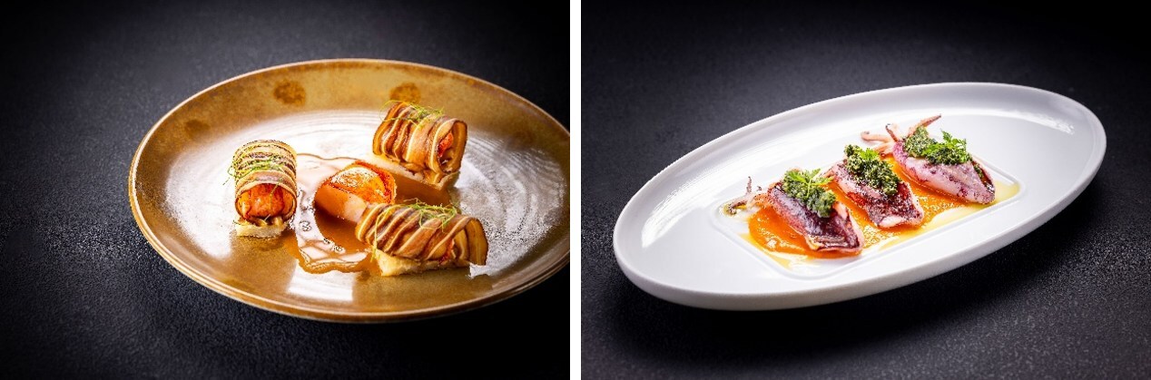 在ARAME,欧陆技法与在地风味碰撞、融合,绽放出令人惊艳的风味。源自法国的"蓝龙虾尾"经碳烤后呈现诱人溏心质感,再以薄切卤水千层顺风(猪耳)包裹,佐以南美安祖辣椒与手工脆皮年糕,点睛之笔则是用台州落头红虾浓缩十倍熬制的虾汁,将海洋的精华滋味展现得淋漓尽致。另一道创意菜肴"惠灵顿土豆"别具匠心,以千层土豆、曼彻格奶酪与培根为馅芯,用法式酥皮包裹烘烤,搭配油封黑牛肝菌与菌菇酱汁,风味浓郁,为宾客带来耳目一新的体验。而"炙烤东山小管"则以其弹牙口感与酸辣鲜美的风味脱颖而出,融合了发酵辣椒、云南树番茄浓缩汁与香草酱,口感层次丰富,充分展现了餐厅在风味创新上的卓越追求。餐厅更有招牌木炭烤海鲜,凭借精准火候,完美锁住食材本真风味。