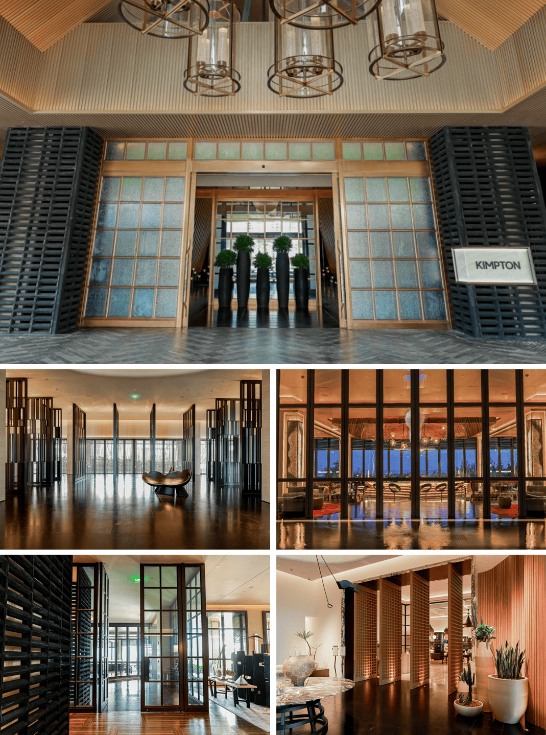 金普顿酒店入口采用留白设计弱化室内外界限,由海福乐提供的自动感应门迎宾客而洞开。大堂前台处,转门屏风采用海福乐可360°旋转的轴门系统,可开可闭可半停,风自由流淌水近在咫尺。健身房的金属框门则采用了海福乐重型地弹簧,兼顾通行效率、安全保障和设计质感。