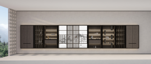 与之相邻的书房空间中,慕士塔格谷雨系统以浅木色定制收纳墙占据视觉中心,规整收纳书籍与艺术摆件。书柜以严谨的柱式序列排列,恰到好处的静,营造了空远意境。金属与板材用巧妙的工艺结合,局部点缀波浪板和特色造型,满足高端个性化需求。金属层板尾部艺术造型,巧妙隐藏灯光,达到了“见光不见灯”的效果,光线柔和地漫射开来,极大地增强了空间的层次感与仪式感。弧度优雅的花瓣造型立柱,与从大自然纹样提取转化形似麦穗成熟后垂头的几何背板,共同孕育着美好幸福的期盼,诉说着源自大地的情绪共鸣。