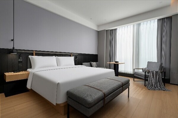 广州黄埔同派酒店共有102间客房,于潮流设计之外,更聚焦商旅实际需求:除标准书桌外,特别增配沙发与协作小桌,方便工作讨论或两人同时办公的需求;客房内配备舒适床型及优质床品,让差旅中的身心得到深度休憩。床头设有一键呼叫前台按钮,令服务响应更直接高效,为宾客省去繁琐的操作步骤。