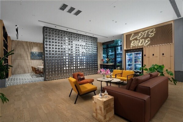 步入酒店,同派标志性的"蜂箱"跃然眼前,这一融合前台、多功能吧台、社交与办公的复合空间,以开放的布局重构旅居社交场景。在这里,无论是商务洽谈、朋友聚会还是一人独享,每位宾客都能找到属于自己的舒适角落。值得一提的是,"蜂箱"一隅藏着一面文化互动墙。它搭载智能跟随灯光装置,当宾客走近,便以光影与之互动。它更可灵动浮现粤语俚语,"得闲"、"夜猫"……既俏皮致敬本土语言文化,又巧妙呼应黄埔作为创新热土的先锋气质。科技有温度,文化可触摸,互动间拉近宾客与城市的距离。