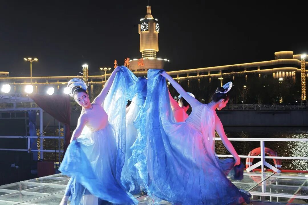 演艺船行驶在津湾码头与“天津之眼”之间,“流动的艺术舞台”伴着《海河咏叹》的乐声来到津湾码头,汽笛声响起,“海河之夜 津彩绽放”灯光在两岸点亮,交响乐与光影秀的魅力在此刻融为一体,绘就一幅浪漫的海河画卷。
